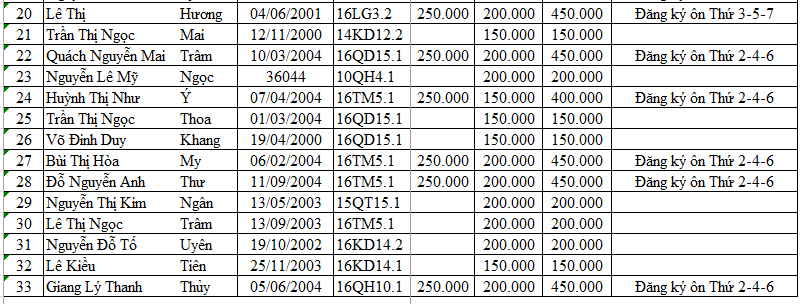 - Lệ phí ôn tập (02 tuần, 18 tiết): 250.000 đồng/SV