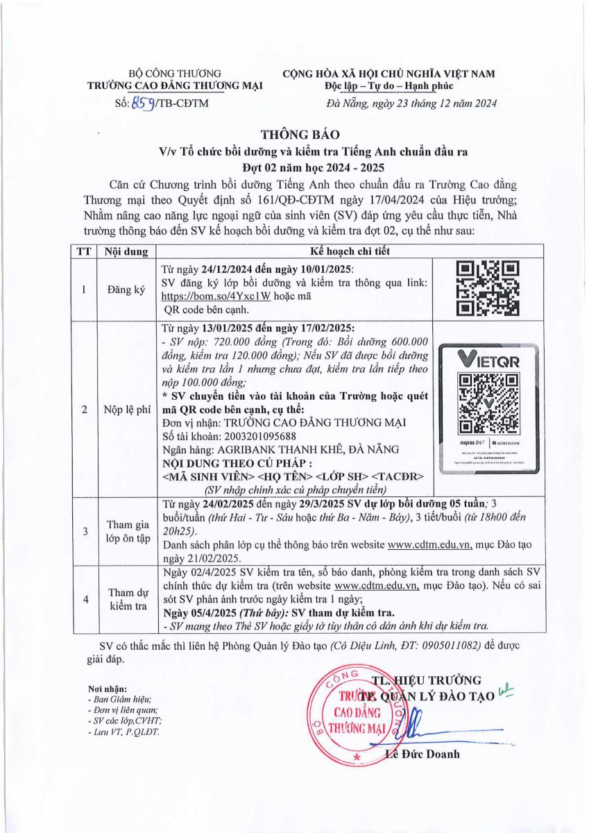 Căn cứ vào danh sách sinh viên đã nộp lệ phí bồi dưỡng và kiểm tra TACĐR chưa đủ để mở lớp. Nhà trường thông báo điều chỉnh kế hoạch tổ chức bồi dưỡng và kiểm tra Tiếng Anh CĐR đợt 2 năm học 2024-2025 cụ thể như sau:
