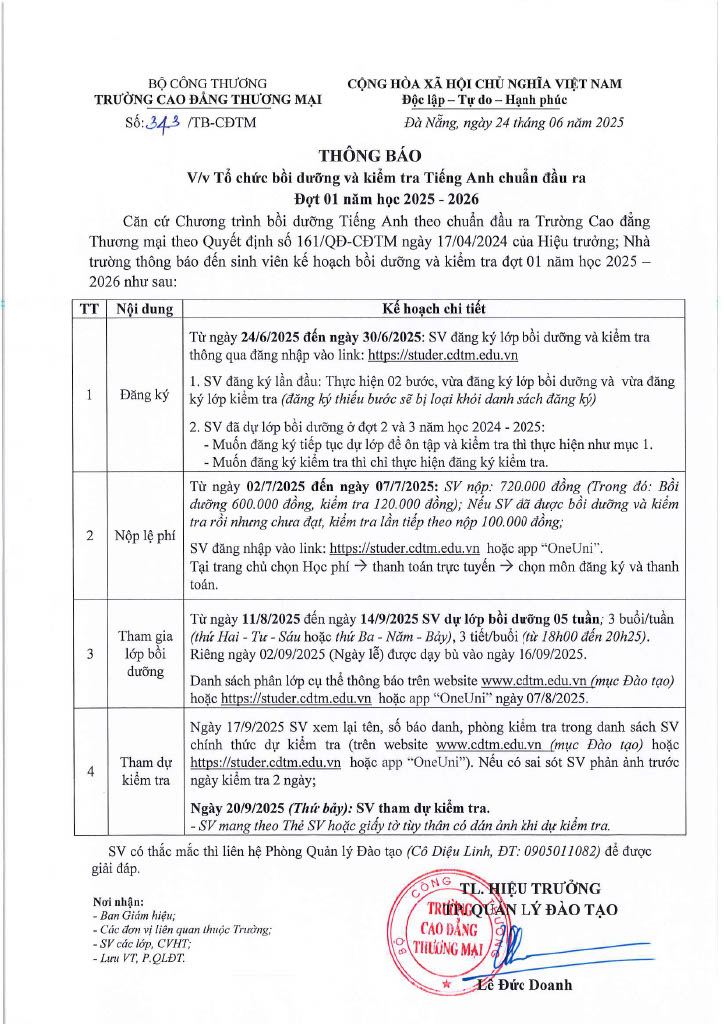 Thông báo tổ chức bồi dưỡng và kiểm tra Tiếng Anh CĐR đợt 2 năm học 2025 - 2026