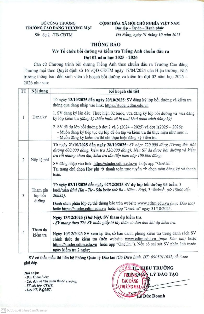Thông báo tổ chức bồi dưỡng và kiểm tra Tiếng Anh CĐR đợt 2 năm học 2025 - 2026