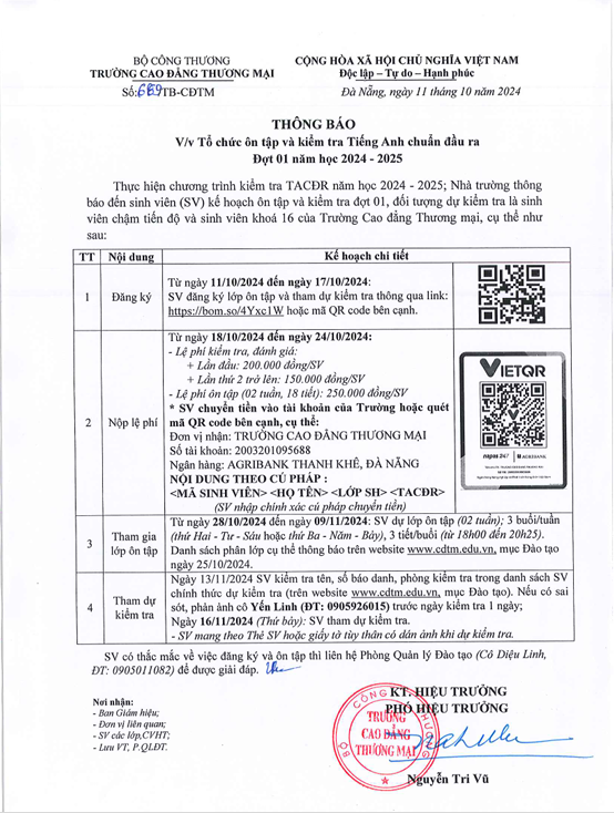 Thông báo tổ chức ôn tập và kiểm tra Tiếng Anh chuẩn đầu ra đợt 1 năm học 2024 - 2025