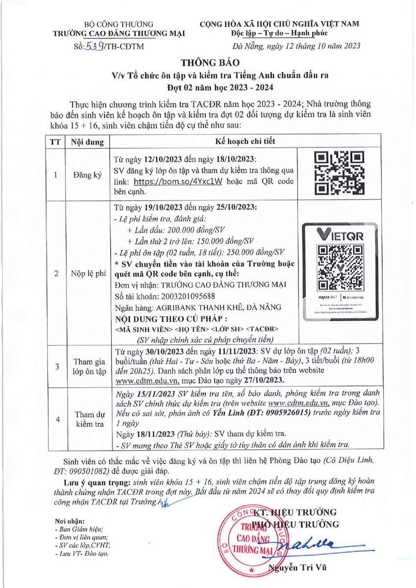 Thông báo ôn tập và kiểm tra Tiếng Anh chuẩn đầu ra đợt 2 năm học 2023 - 2024