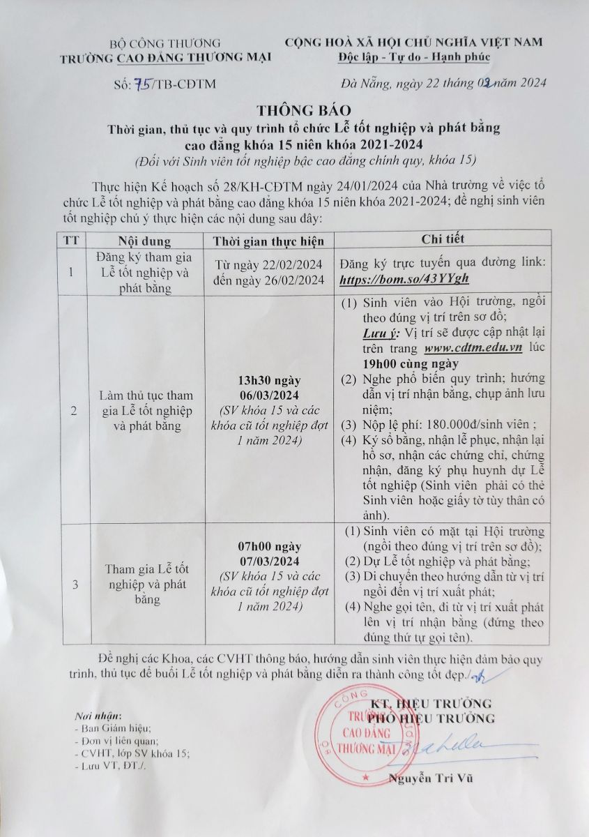 Thông báo thời gian thủ tục và quy trình tổ chức Lễ tốt nghiệp và phát bằng cao đăng khóa 15 niên khóa 2021-2024