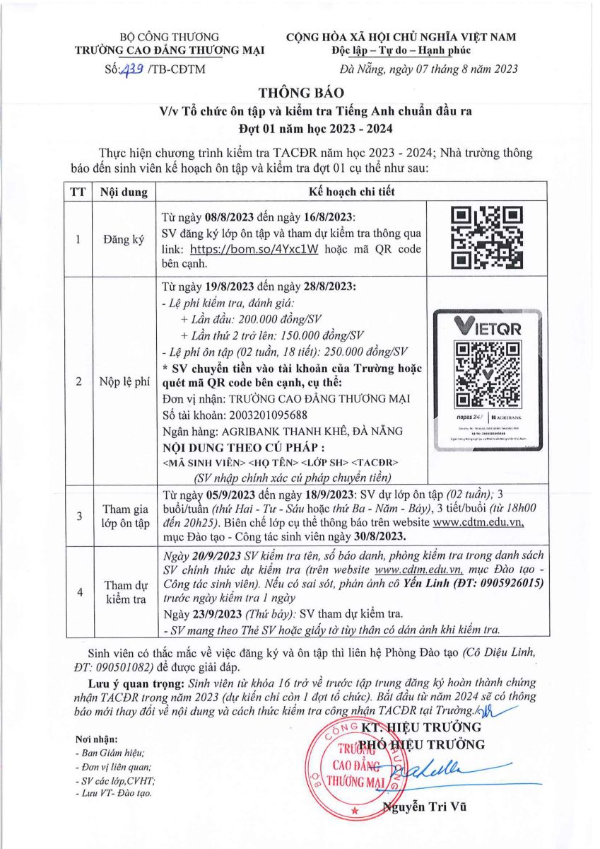 THÔNG BÁO Tổ chức ôn tập và kiểm tra Tiếng Anh chuẩn đầu ra Đợt 01 năm học 2023 - 2024