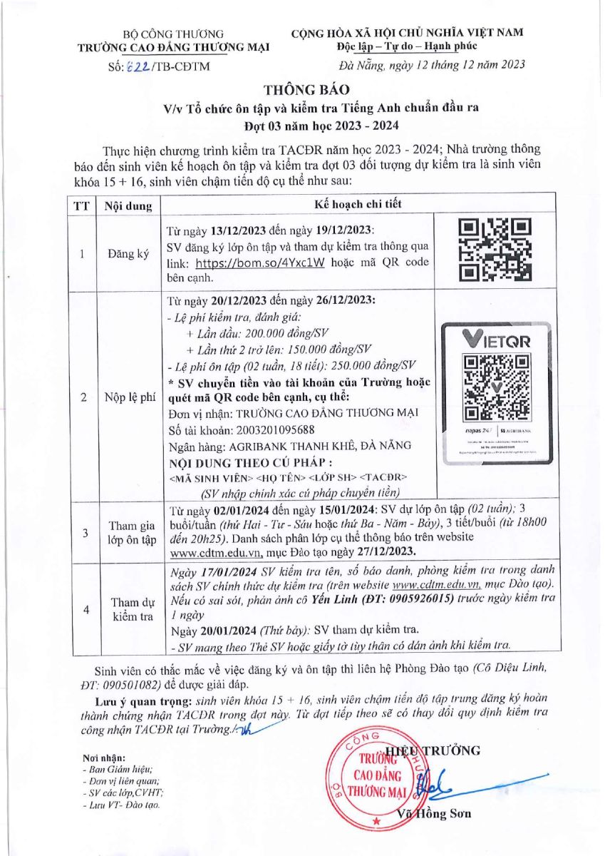 Thông báo tổ chức ôn tập và kiểm tra Tiếng Anh chuẩn đầu ra đợt 3 năm học 2023 - 2024