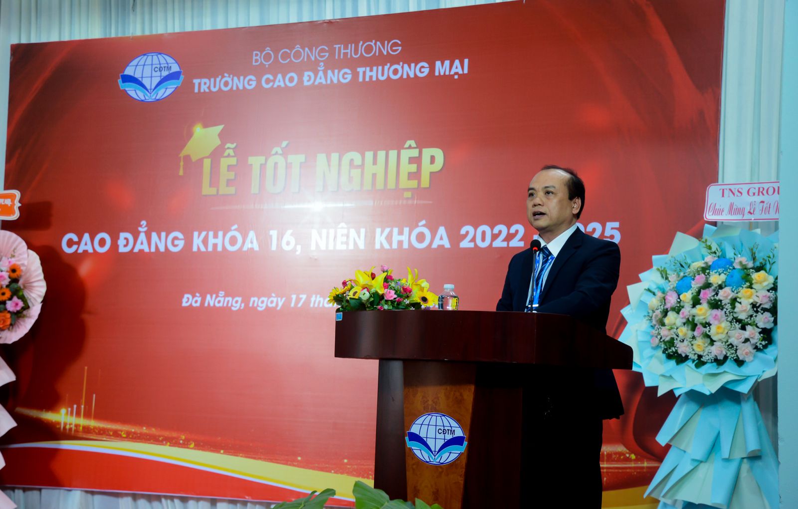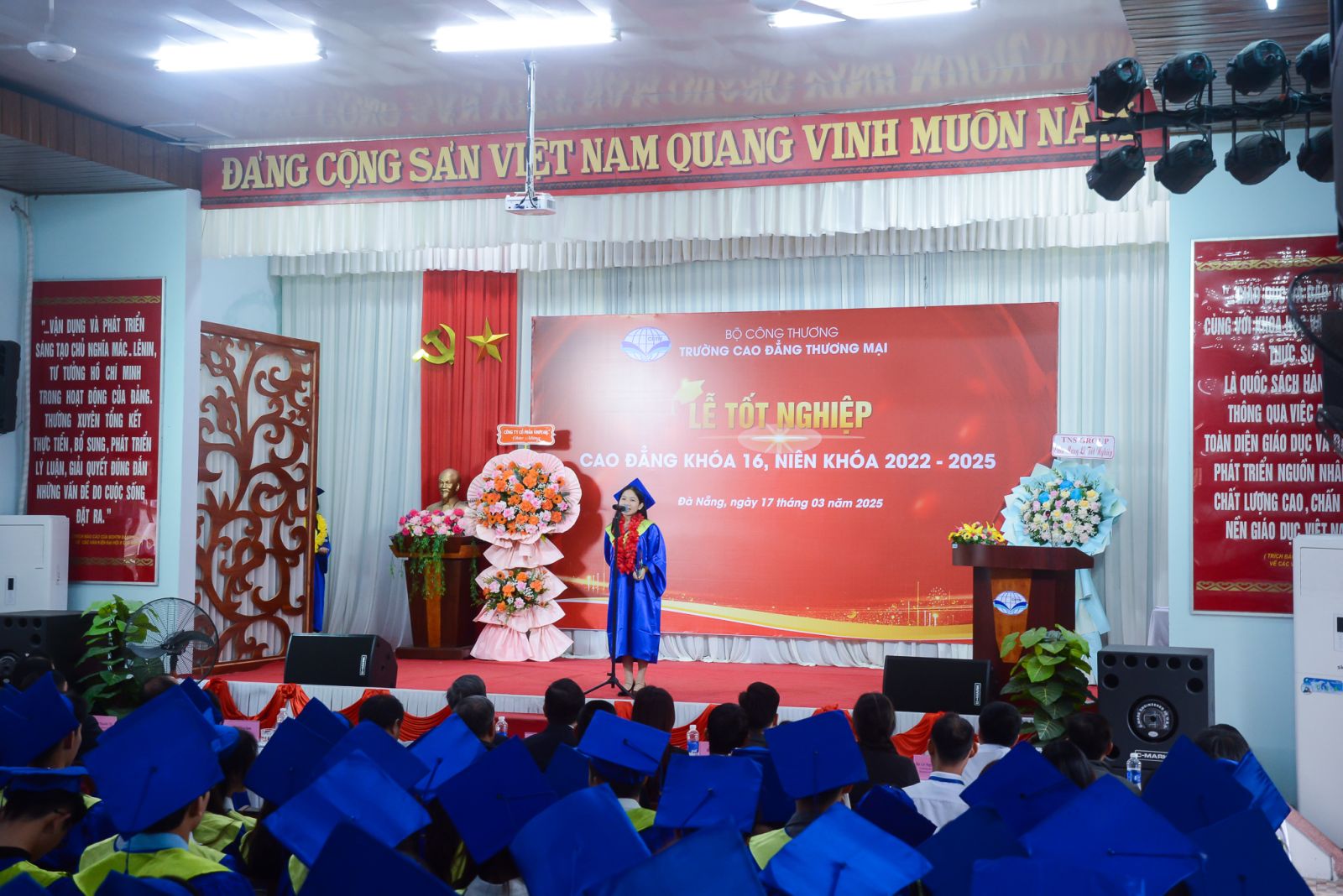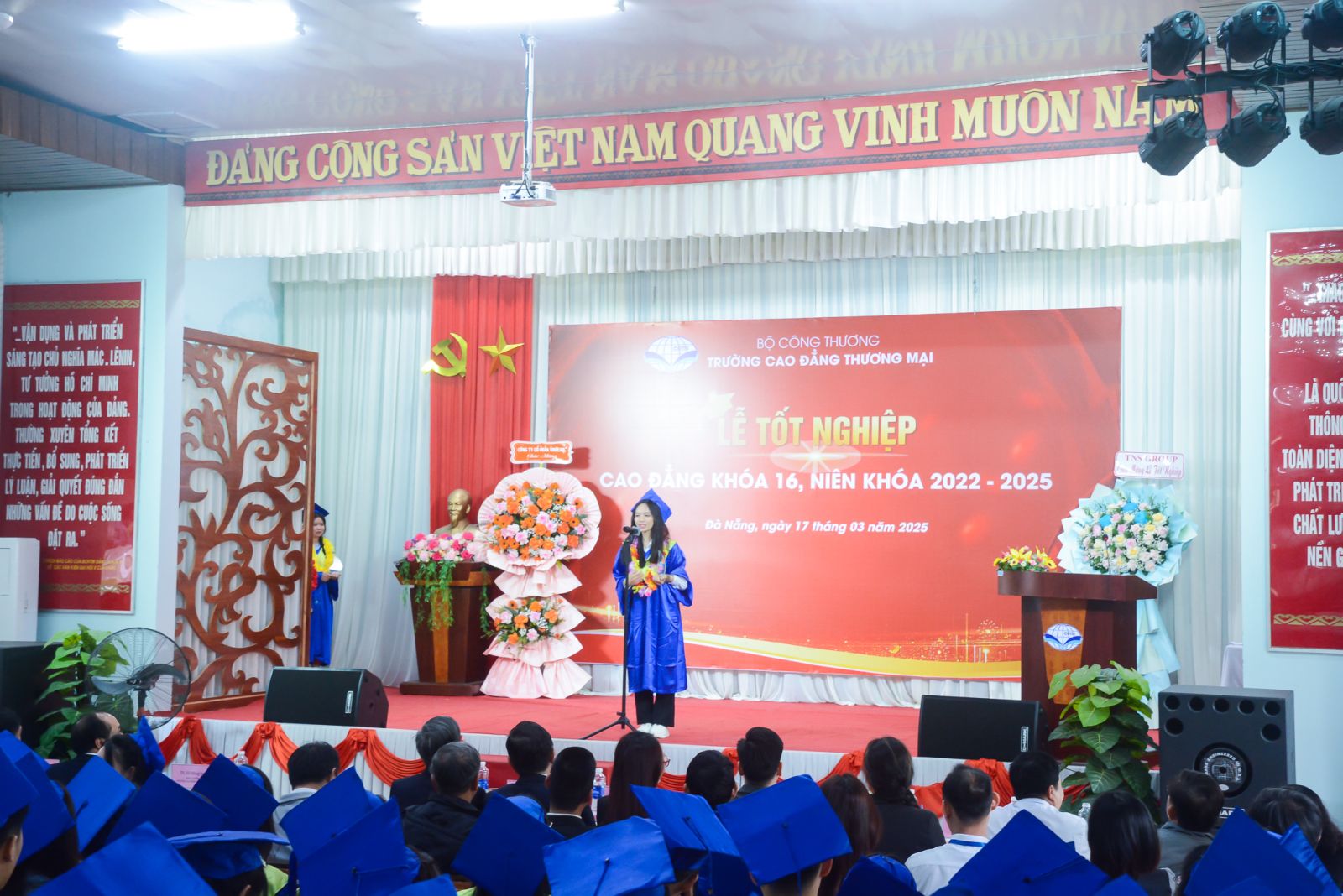 Phát biểu chúc mừng các tân cử nhân, TS. Võ Hồng Sơn - Hiệu trưởng ghi nhận những nỗ lực và đóng góp của sinh viên khóa 16 đối với quá trình đào tạo và phát triển của trường. Thầy nhấn mạnh: “2 năm rưỡi, thời gian không dài, nhưng cũng đủ để thầy và trò chúng ta cùng trải qua bao khoảnh khắc vui buồn, những buổi học căng thẳng, những chuyến đi với sự trải nghiệm thú vị, với những bỡ ngỡ, áp lực khi thực tập, thực tế tại doanh nghiệp… để hôm nay, các em có thể tự hào đứng trên sân khấu này, đón nhận trái ngọt của những nỗ lực không ngừng nghỉ. Mỗi tấm bằng tốt nghiệp chính là kết quả của một quá trình phấn đấu không mệt mỏi, là minh chứng cho sức mạnh của sự kiên trì, nỗ lực và lòng đam mê học hỏi”. Thầy chúc mừng thành công bước đầu của các em, hy vọng 352 tân cử nhân hôm nay sẽ luôn luôn tích cực vươn lên trong cuộc sống, nỗ lực hết mình trong nghề mà mình đã chọn. Chia tay hôm nay, xin hẹn ngày gặp lại. Hãy nhớ rằng, dù sau này các em ở đâu, làm gì, các em luôn là một phần không thể thiếu trong ngôi nhà Cao đẳng Thương mại, và các thầy cô luôn tự hào về các em.
