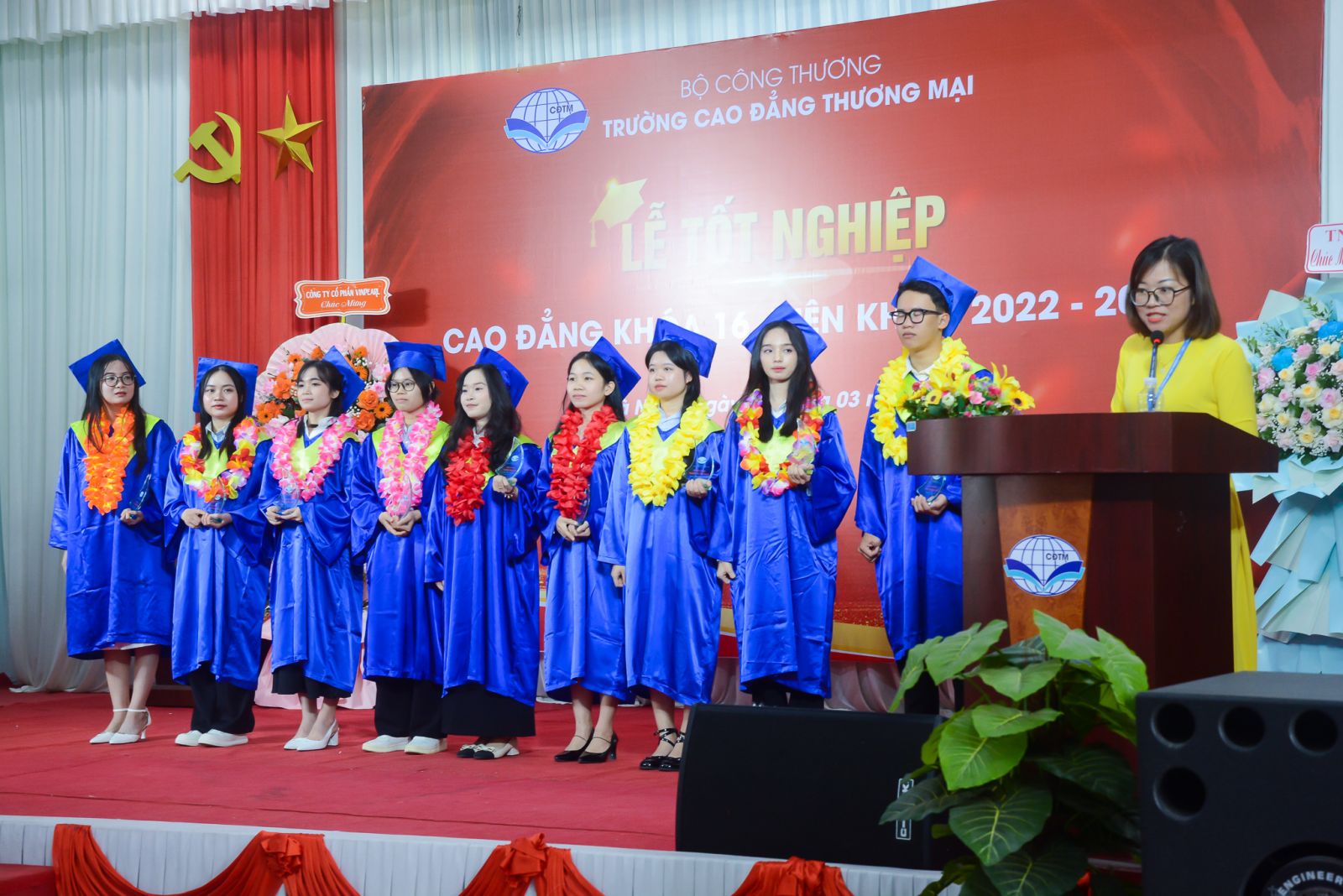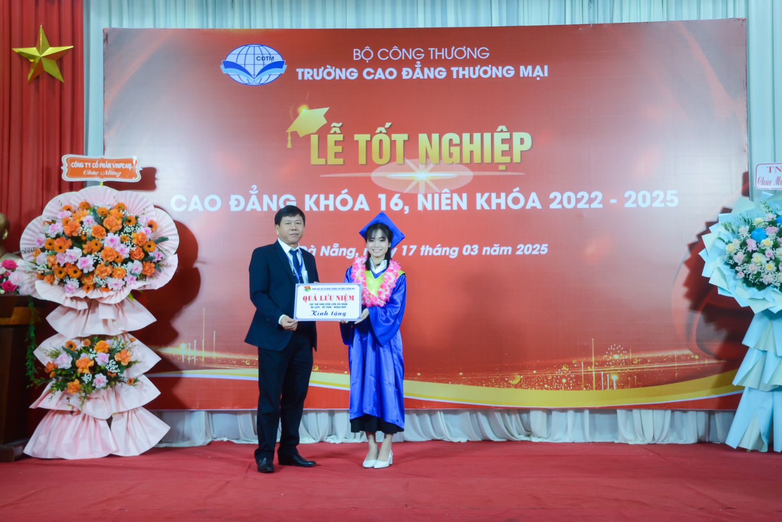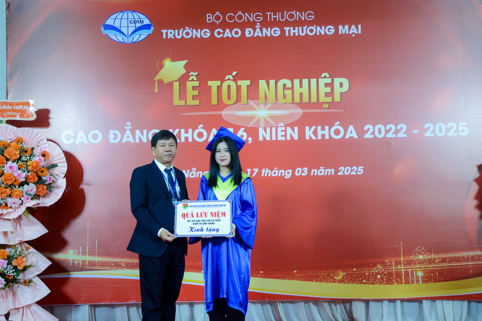 Phát biểu chúc mừng các tân cử nhân, TS. Võ Hồng Sơn - Hiệu trưởng ghi nhận những nỗ lực và đóng góp của sinh viên khóa 16 đối với quá trình đào tạo và phát triển của trường. Thầy nhấn mạnh: “2 năm rưỡi, thời gian không dài, nhưng cũng đủ để thầy và trò chúng ta cùng trải qua bao khoảnh khắc vui buồn, những buổi học căng thẳng, những chuyến đi với sự trải nghiệm thú vị, với những bỡ ngỡ, áp lực khi thực tập, thực tế tại doanh nghiệp… để hôm nay, các em có thể tự hào đứng trên sân khấu này, đón nhận trái ngọt của những nỗ lực không ngừng nghỉ. Mỗi tấm bằng tốt nghiệp chính là kết quả của một quá trình phấn đấu không mệt mỏi, là minh chứng cho sức mạnh của sự kiên trì, nỗ lực và lòng đam mê học hỏi”. Thầy chúc mừng thành công bước đầu của các em, hy vọng 352 tân cử nhân hôm nay sẽ luôn luôn tích cực vươn lên trong cuộc sống, nỗ lực hết mình trong nghề mà mình đã chọn. Chia tay hôm nay, xin hẹn ngày gặp lại. Hãy nhớ rằng, dù sau này các em ở đâu, làm gì, các em luôn là một phần không thể thiếu trong ngôi nhà Cao đẳng Thương mại, và các thầy cô luôn tự hào về các em.