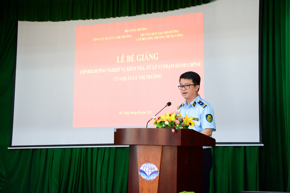 Phát biểu tổng kết khóa học tại Lễ bế giảng và trao Giấy chứng nhận cho các học viên, đồng chí Hoàng Quốc Bình - Phó Vụ trưởng Vụ tổ chức cán bộ, Tổng Cục quản lý thị trường cho biết với sự quan tâm của Lãnh đạo Bộ Công Thương, cùng với sự quyết tâm của Lãnh đạo Tổng cục QLTT, sự phối hợp của Trường Cao đẳng Thương mại và Trường Đào tạo, bồi dưỡng Cán bộ Công Thương Trung ương lớp học đã được tổ chức và đạt mục tiêu đề ra.