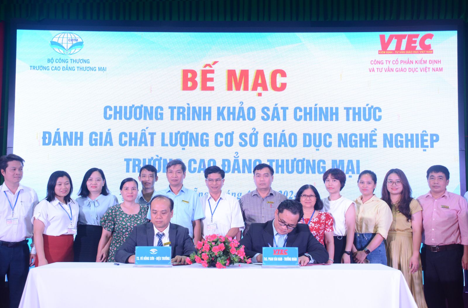 Kết thúc buổi làm việc, TS. Võ Hồng Sơn - Hiệu trưởng Nhà trường và ThS. Phan Văn Nam - Trưởng đoàn Đánh giá ngoài đã cùng ký biên bản hoàn thành chương trình khảo sát chính thức cơ sở GDNN tại Trường Cao đẳng Thương mại.