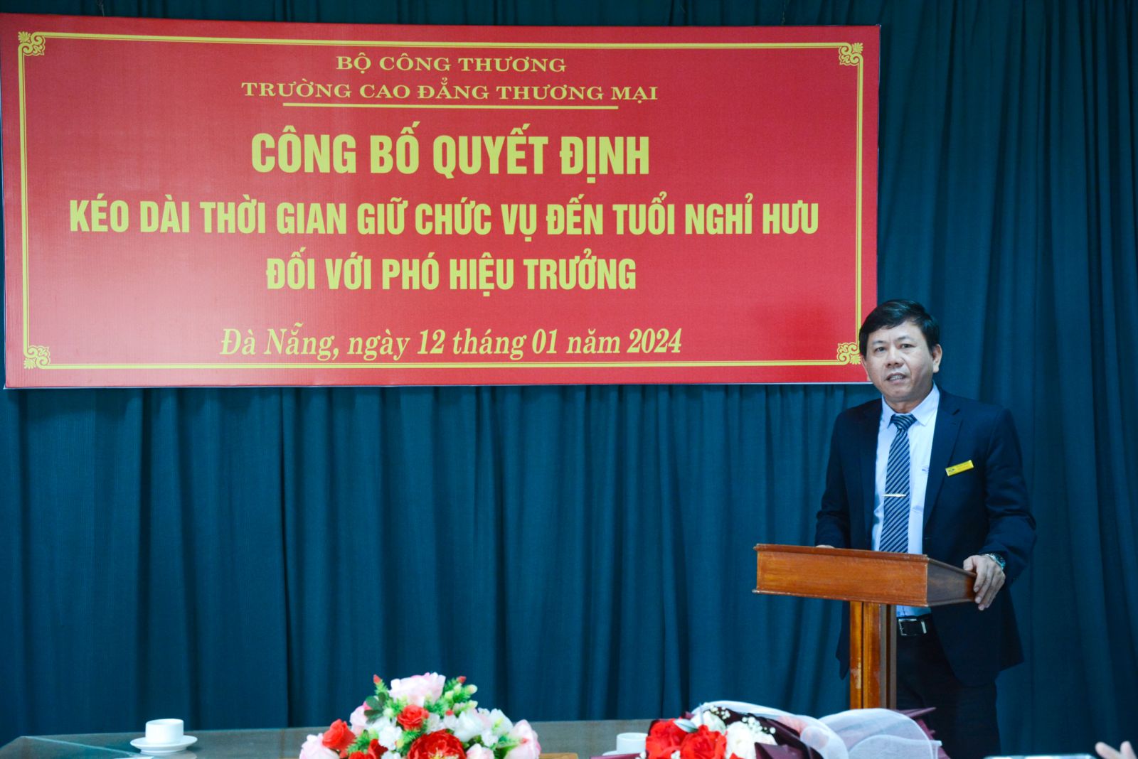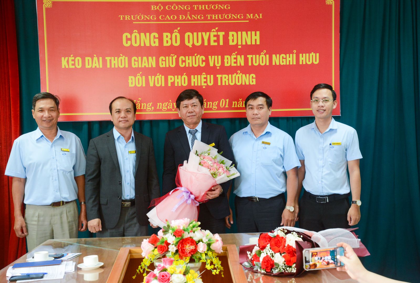 Tại buổi lễ thừa ủy quyền của Bộ Công Thương, đồng chí Phan Tấn Dũng - UV BTV, Trưởng ban Tổ chức Quận ủy Thanh Khê trao Quyết định kéo dài thời gian giữ chức vụ đến tuổi nghỉ hưu và tặng hoa chúc mừng ThS. Trần Văn Sang - Phó Hiệu trưởng Trường Cao đẳng Thương mại.