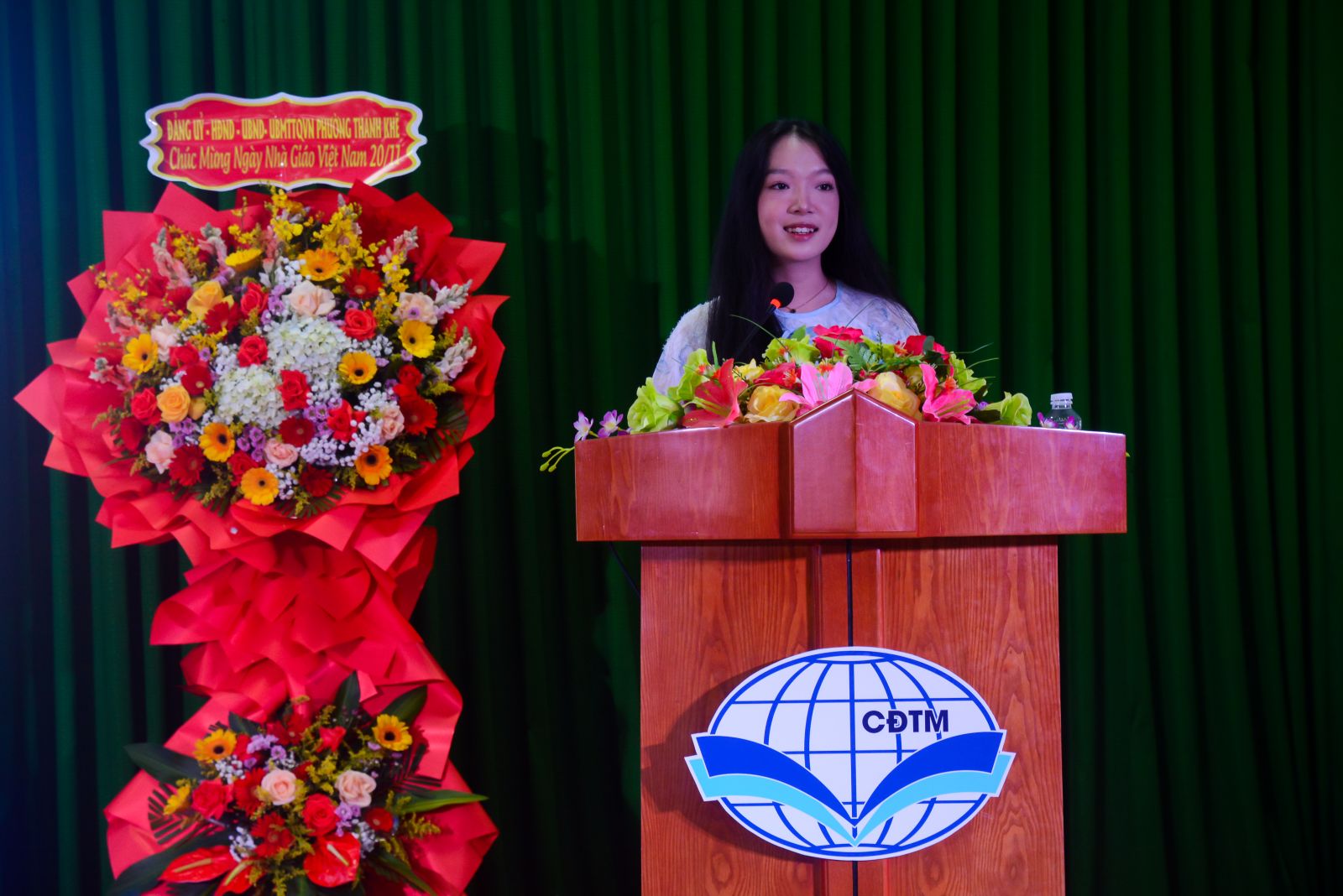 Trong không khí trang nghiêm ngày lễ Hiến Chương, sinh viên Phạm Thanh Bảo Uyên, sinh viên lớp 18QD17.2 thay mặt cho học sinh, sinh viên toàn trường đã gửi tới thầy cô giáo những lời tri ân sâu sắc và dâng tặng thầy cô lẵng hoa tươi thắm thể hiện tình yêu và lòng biết ơn của các thế hệ học sinh, sinh viên đối với sự nghiệp trồng người của các thầy cô giáo.