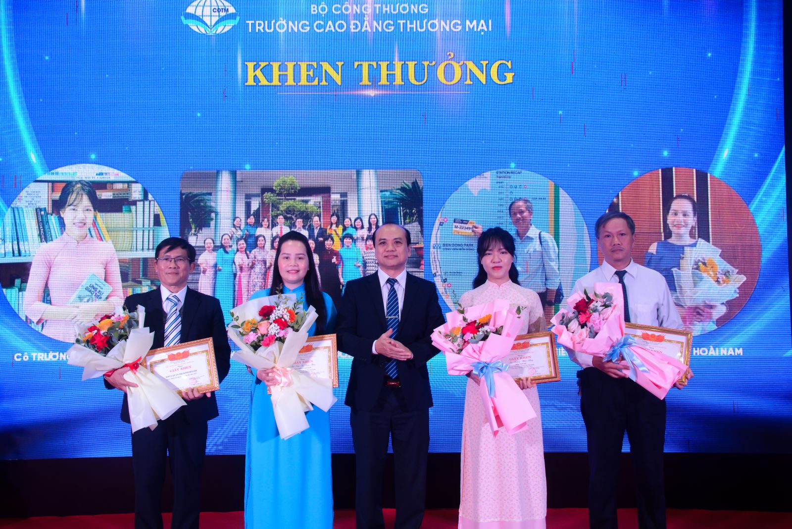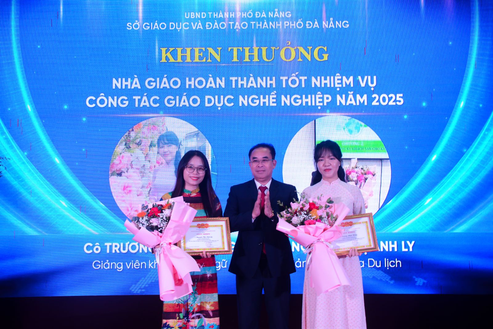 Nhân dịp này, Giám đốc Sở Giáo dục và Đào tạo thành phố Đà Nẵng đã có quyết định khen thưởng hai giảng viên Trường Cao đẳng Thương mại hoàn thành tốt nhiệm vụ công tác GDNN năm 2025 cho cho cô Trương Nhật Hằng - Giảng viên khoa Ngoại ngữ và cô Nguyễn Thị Ánh Ly - Giảng viên khoa Du lịch; Hiệu trưởng Trường Cao đẳng Thương mại cũng đã khen thưởng tập thể đơn vị đã hoàn thành tốt nhiệm vụ giảng dạy đối với khoa Quản trị kinh doanh, khen thưởng giảng viên đạt kết quả cao trong phong trào thi đua giờ giảng tích cực đối với cô Trương Nhật Hằng - Giảng viên Bộ môn Tiếng Anh cơ bản và cô Trần Thị Hoài Nam - Giảng viên Bộ môn Quản trị doanh nghiệp, khen thưởng thầy Lê Trần Thanh Hiếu - Giảng viên khoa Khoa học cơ bản vì có thành tích trong công tác Chuyển đổi số của Nhà trường.