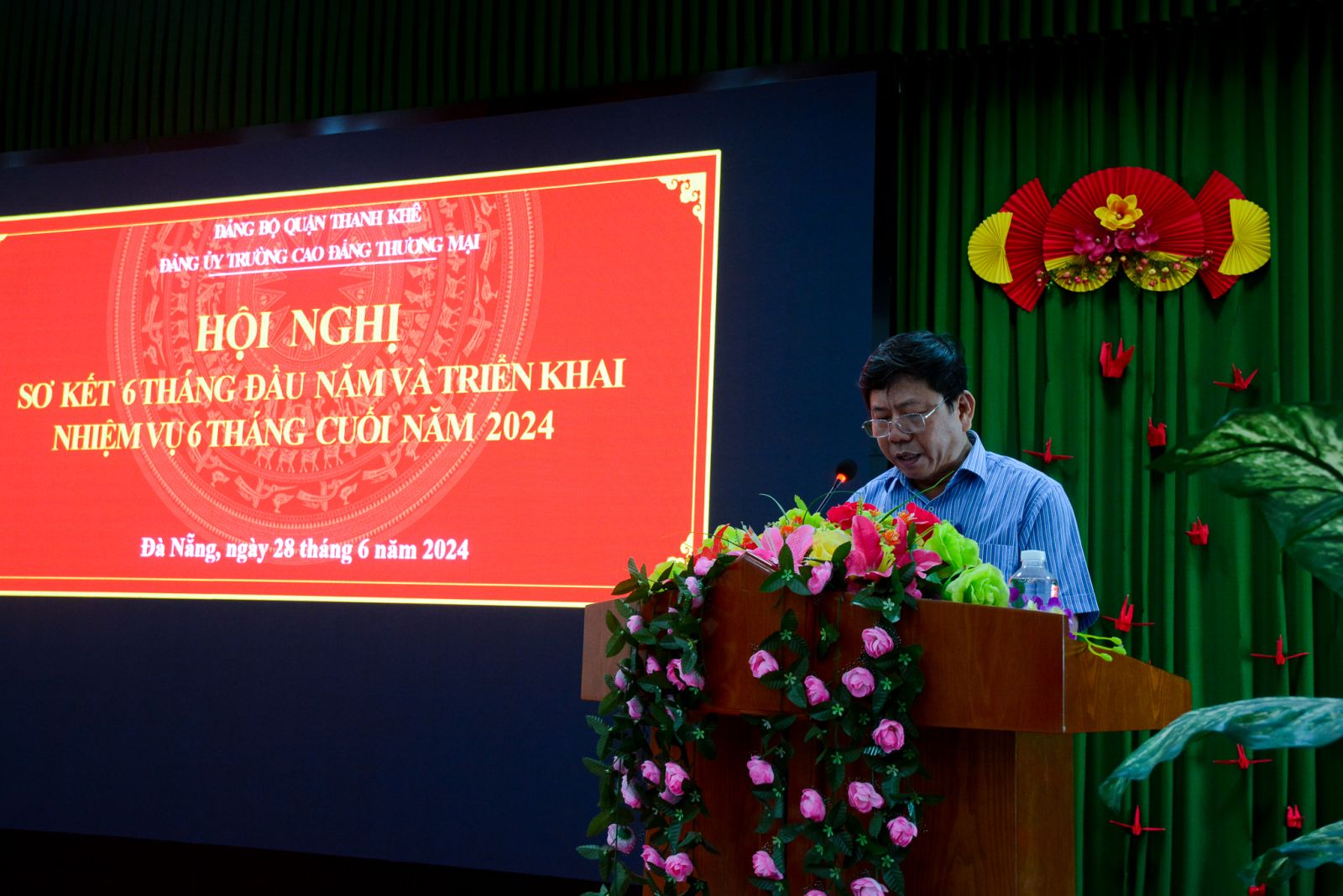 Phát biểu chỉ đạo Hội nghị, đồng chí Phan Tấn Dũng - UV BTV, Trưởng ban Tổ chức Quận ủy Thanh Khê biểu dương, ghi nhận và đánh giá cao các thành tích mà Đảng bộ Trường đã đạt được trên các mặt trong 6 tháng đầu năm 2024; Đồng chí cũng chia sẻ những khó khăn chung của thầy và trò Trường Cao đẳng Thương mại và đề nghị Đảng bộ Nhà trường cần tiếp tục phát huy những thành tích đã đạt được trong 6 tháng đầu năm 2024, khắc phục những tồn tại, hạn chế, tăng cường đoàn kết, nỗ lực phấn đấu để hoàn thành xuất sắc nhiệm vụ 6 tháng cuối năm 2024.