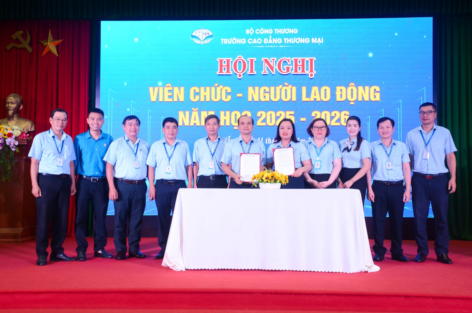 Kết thúc chương trình, Hội nghị thông qua Nghị quyết Hội nghị viên chức, người lao động năm học 2025 – 2026, đồng thời ký Cam kết thi đua giữa Chính quyền và Công đoàn cơ sở Nhà trường.
