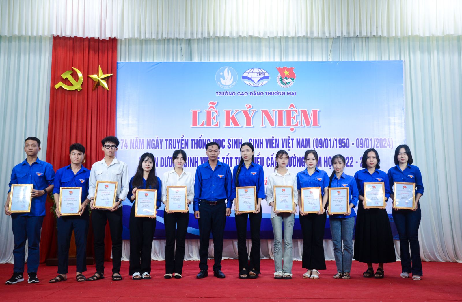 Tối 08-01, hòa trong không khí rộn ràng, vui tươi chào đón năm mới 2024, Trường Cao đẳng Thương mại long trọng tổ chức Lễ mít tinh kỷ niệm 74 năm ngày truyền thống học sinh, sinh viên (09/01/1950 – 09/01/2024), tuyên dương sinh viên 5 tốt tiêu biểu cấp trường năm học 2022 – 2023 và trao hỗ trợ vé xe cho sinh viên ở xa có hoàn cảnh khó khăn về quê ăn tết Giáp Thìn 2024.