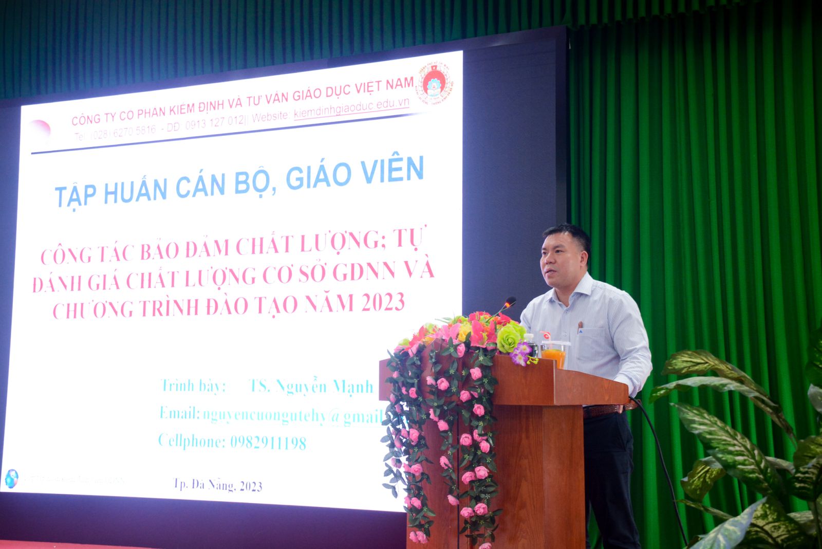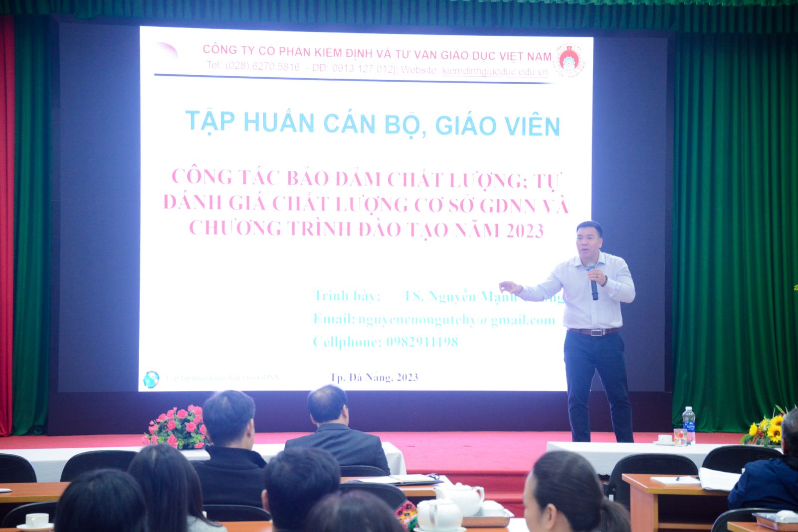 Tại các buổi tập huấn, TS. Nguyễn Mạnh Cường - Phó Giám đốc Công ty Cổ phần Kiểm định và Tư vấn giáo dục Việt Nam cùng với Nhà trường đã thảo luận, chia sẻ các nội dung và kỹ năng cơ bản của kiểm định chất lượng cơ sở giáo dục nghề nghiệp và chương trình đào tạo. Cụ thể, TS. Nguyễn Mạnh Cường đã hướng dẫn Nhà trường thực hiện công tác thu thập, sắp xếp và lưu trữ hệ thống minh chứng một cách khoa học và dễ truy xuất khi cần thiết. Đồng thời, TS. Nguyễn Mạnh Cường cũng hướng dẫn chi tiết về kỹ năng viết báo cáo tự đánh giá theo quy định hiện hành của Bộ Lao động – Thương binh và Xã hội.