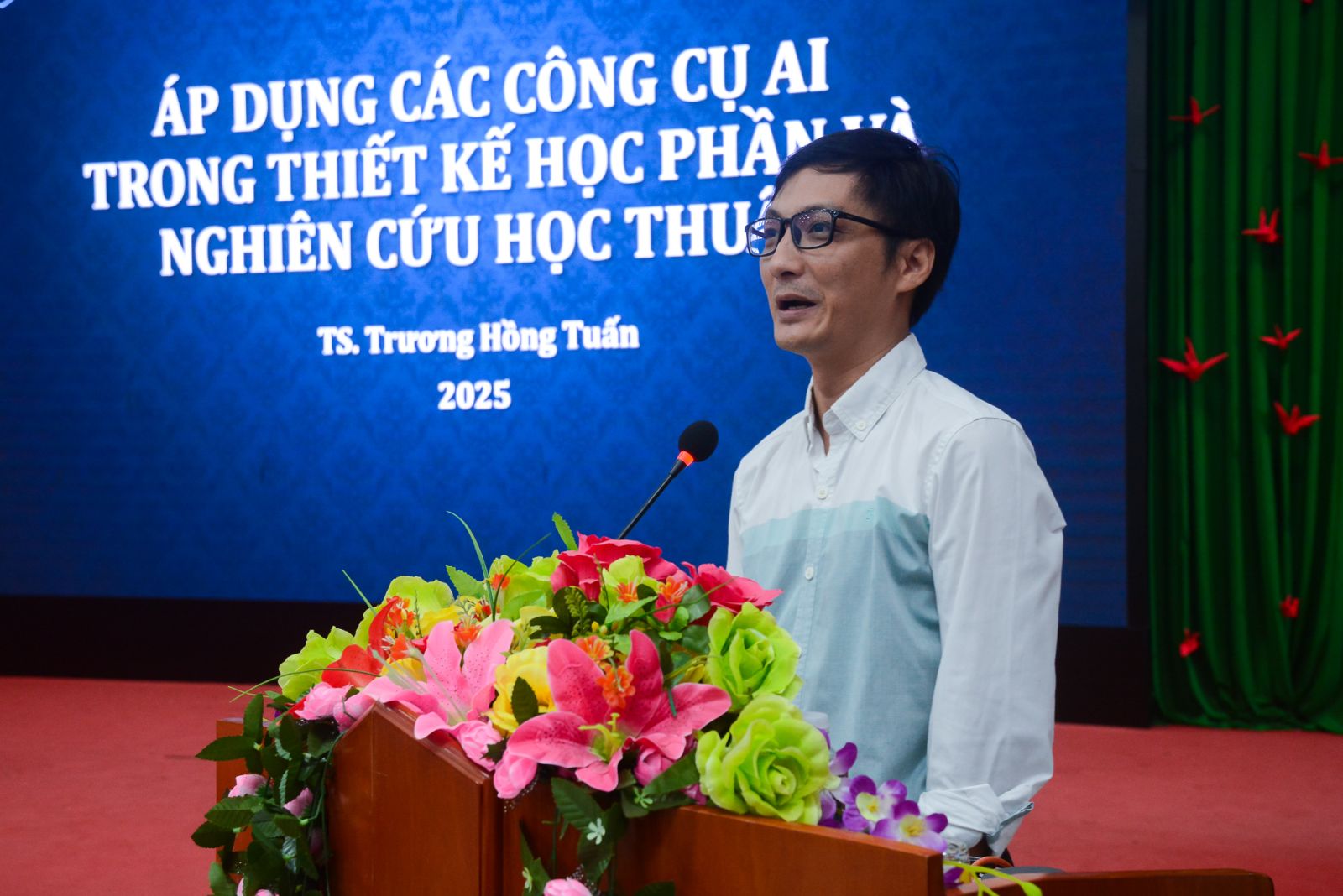 Tại tọa đàm, các báo cáo viên lần lượt trình bày các tham luận: Áp dụng các công cụ AI trong thiết kế học phần và nghiên cứu học thuật (trình bày bởi TS. Trương Hồng Tuấn - Trưởng bộ môn Thương mại điện tử - Trường Đại học kinh tế); Quy trình triển khai các ứng dụng AI trong lĩnh vực giáo dục đào tạo (trình bày bởi ThS. Nguyễn Tuấn Anh - Giảng viên CNTT VTC Academy Plus Đà Nẵng). Bên cạnh phần trình bày tham luận, tọa đàm diễn ra sôi nổi với các thảo luận, trao đổi giữa đại biểu khách mời chuyên gia, giảng viên nhà trường. Các nội dung thảo luận tập trung vào tiềm năng, rủi ro, chi phí triển khai AI, cũng như làm sao ứng dụng AI hiệu quả mà vẫn đảm bảo tính bền vững và phù hợp với mục tiêu của Nhà trường.