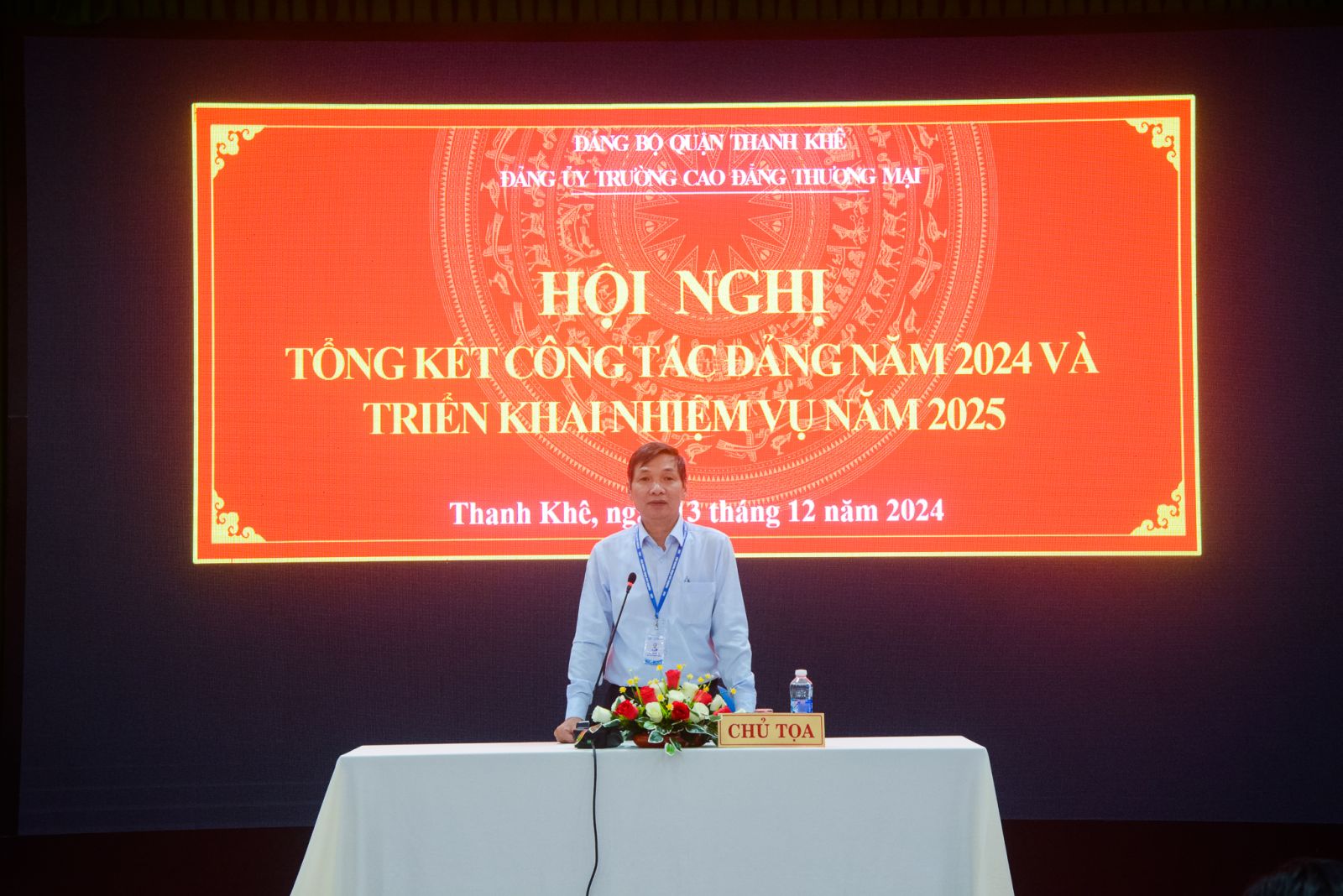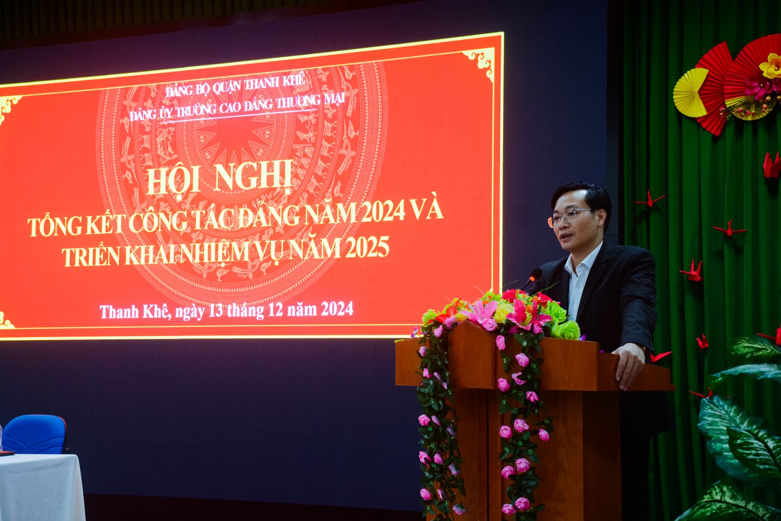 Phát biểu chỉ đạo Hội nghị, đồng chí Phan Tấn Dũng - Ủy viên Ban thường vụ, Trưởng ban Tổ chức Quận ủy biểu dương, ghi nhận và đánh giá cao các thành tích mà Đảng bộ Trường đã đạt được trên các mặt trong năm 2024, hoạt động kiểm tra, giám sát được đẩy mạnh, công tác đoàn thể dân vận được chỉ đạo thực hiện tốt,... Đồng chí cũng chia sẻ những khó khăn chung của thầy và trò Trường Cao đẳng Thương mại và đề nghị Đảng bộ nhà trường cần tiếp tục phát huy những thành tích đã đạt được trong năm 2024, khắc phục những tồn tại, hạn chế, tăng cường đoàn kết, nỗ lực phấn đấu để hoàn thành xuất sắc nhiệm vụ năm 2025.