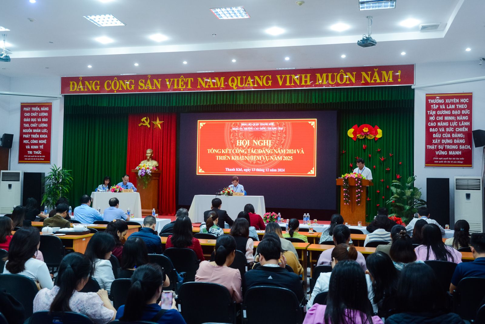 Tại Hội nghị, thay mặt Đảng bộ Trường, đồng chí Trần Văn Sang - Phó Bí thư Đảng ủy, Phó Hiệu trưởng trình bày tóm tắt báo cáo tổng kết công tác năm 2024 và phương hướng, nhiệm vụ, giải pháp công tác năm 2025. Theo đó, trong năm 2024, Đảng bộ nhà trường đã chủ động ban hành các văn bản lãnh đạo, chỉ đạo, xây dựng kế hoạch và tổ chức quán triệt, tuyên truyền, phổ biến, triển khai thực hiện Nghị quyết, Chỉ thị, các chuyên đề hằng năm kịp thời đến toàn thể cán bộ, đảng viên, viên chức và sinh viên nhà trường, tổ chức rà soát, sửa đổi bổ sung và quán triệt quy chế, quy định, thực hiện Quy chế dân chủ, để CBVC-NLĐ phát huy quyền và trách nhiệm viên chức trong giai đoạn khó khăn hiện nay phải vượt qua.