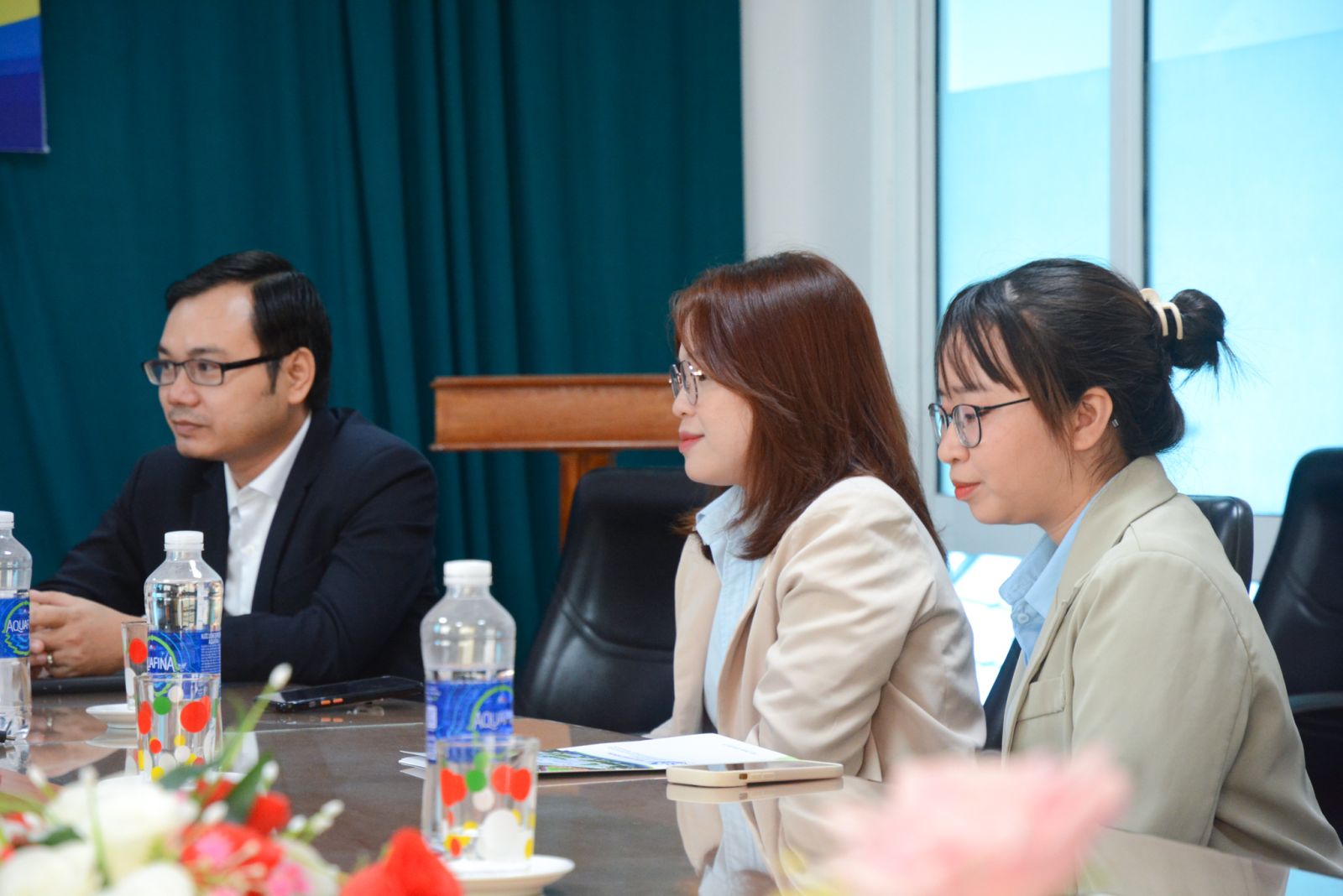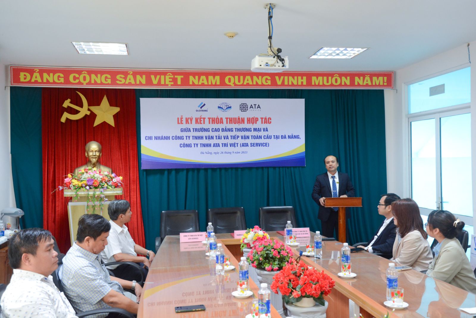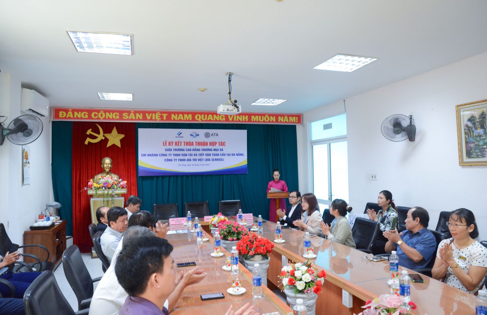 Buổi lễ ký kết hợp tác có sự tham dự của chị Nguyễn Thị Mỹ Hiền - Phó Giám đốc chi nhánh kiêm Trưởng phòng Quan hệ khách hàng Công ty TNHH Vận tải và Tiếp vận Toàn Cầu tại Đà Nẵng; anh Trình Quốc Việt - Chủ tịch Hội đồng Quản trị Công ty TNHH ATA Trí Việt; TS. Võ Hồng Sơn - Hiệu trưởng Nhà trường; TS. Nguyễn Tri Vũ - Phó Hiệu trưởng; ThS. Trần Văn Sang - Phó Hiệu trưởng; cùng trưởng các đơn vị, bộ môn Trường Cao đẳng Thương mại.