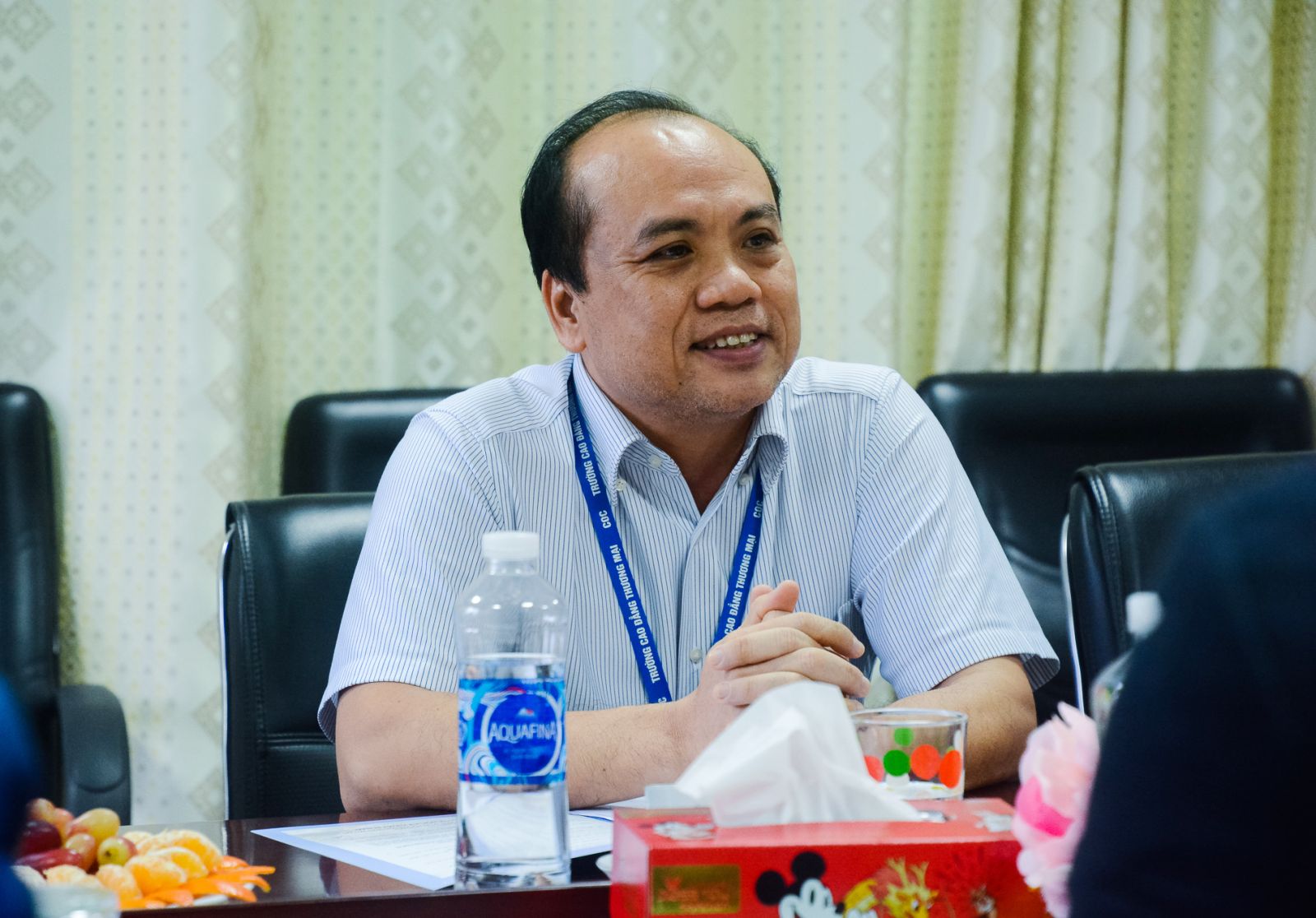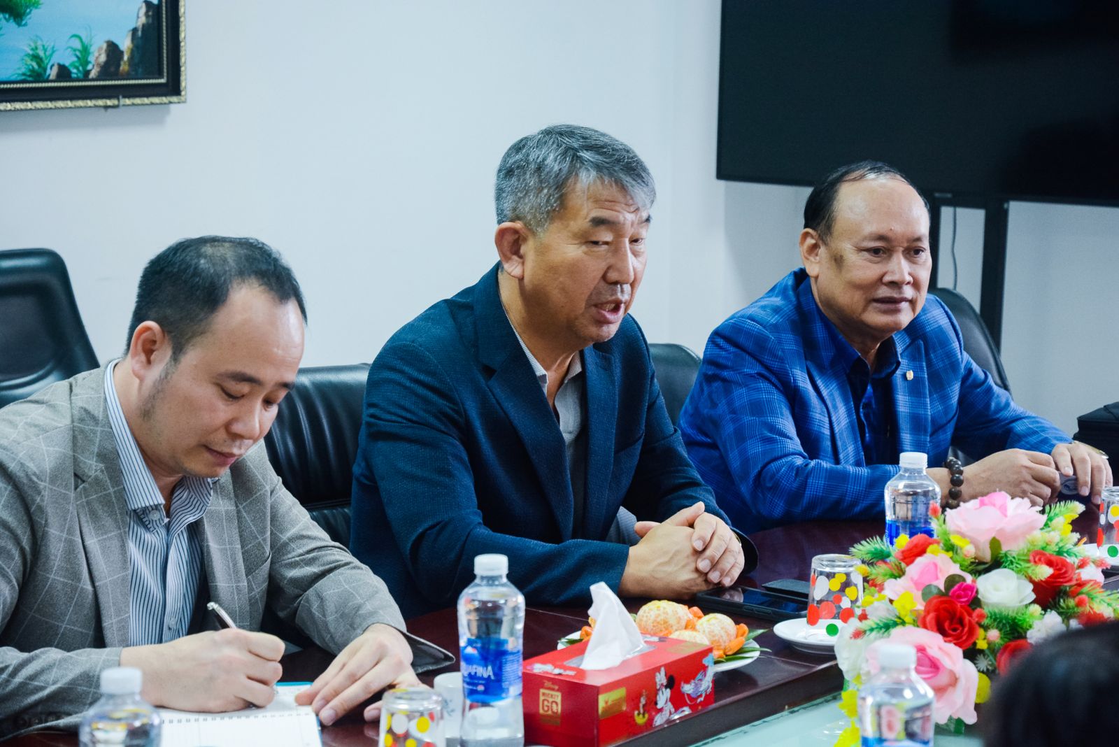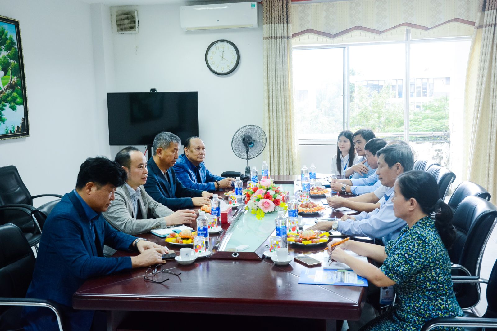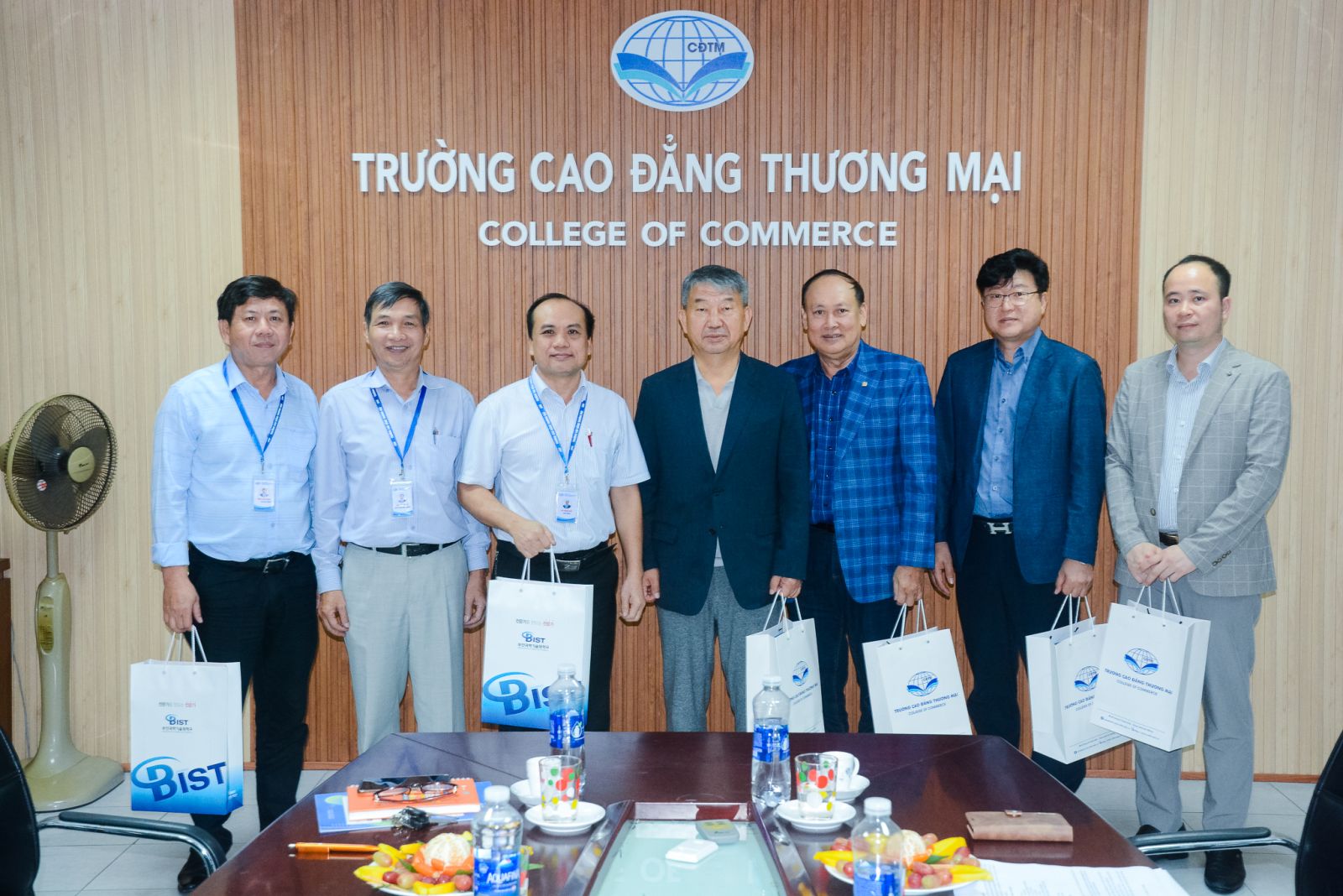 Buổi thảo luận hợp tác về phía Trường Đại học Khoa học Kỹ thuật Busan có sự tham dự của: ông JEONG HAENG KYU - Tiến sỹ, Viện trưởng Viện Giáo dục quốc tế, ông JEONG CHI HWA - Trưởng phòng Giáo dục quốc tế; Ông Bùi Đình Miện - Tổng phụ trách Đối ngoại, Tuyển sinh và Quản lý du học sinh; về Trường Cao đẳng Thương mại có TS. Võ Hồng Sơn - Hiệu trưởng; TS. Nguyễn Tri Vũ - Phó Hiệu trưởng; ThS. Trần Văn Sang - Phó Hiệu trưởng.