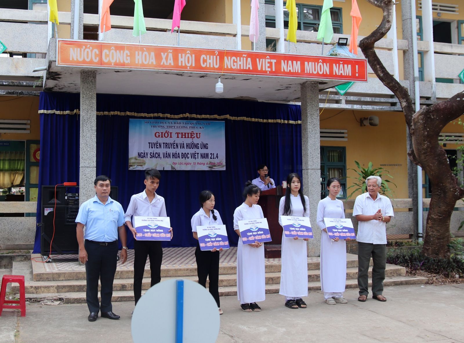 Tại đây, TS. Nguyễn Quý Nhẫn - Phó Hiệu trưởng đã trao tặng 10 suất học bổng “COC - Chắp cánh ước mơ” mỗi suất trị giá 500.000đ đồng cho các em học sinh có hoàn cảnh khó khăn vươn lên chăm ngoan, hiếu học của hai trường THPT Lương Thúc Kỳ và THPT Hoàng Diệu.
